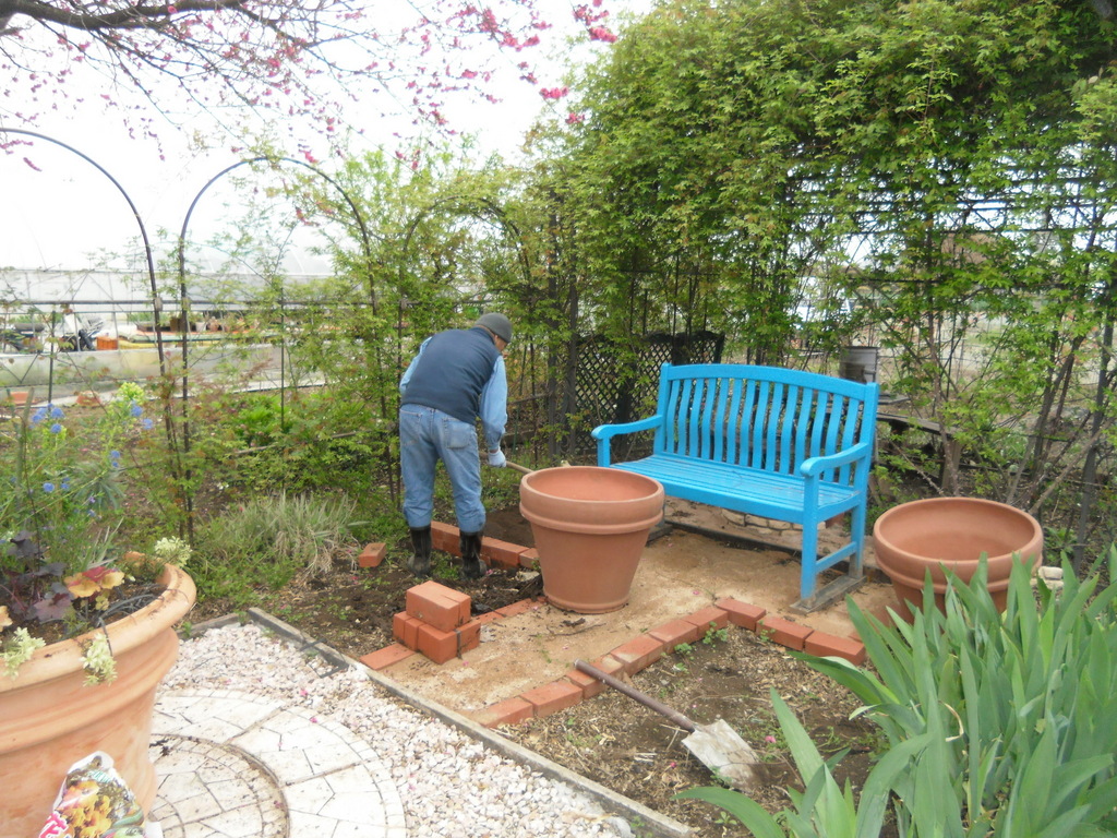 青色のベンチが宝石のようですね。大きな鉢は護衛ですか?