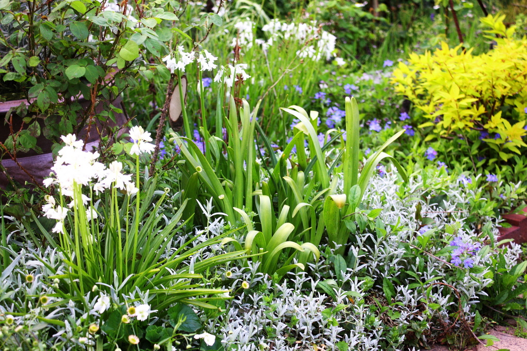 白とブルーとシルバーリーフに黄緑の葉がアクセントの素敵にまとまった一角。