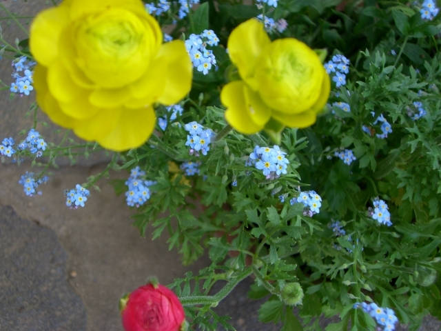 こぼれ種のワスレナグサにラナンキュラスの黄色が映えます(*^_^*)