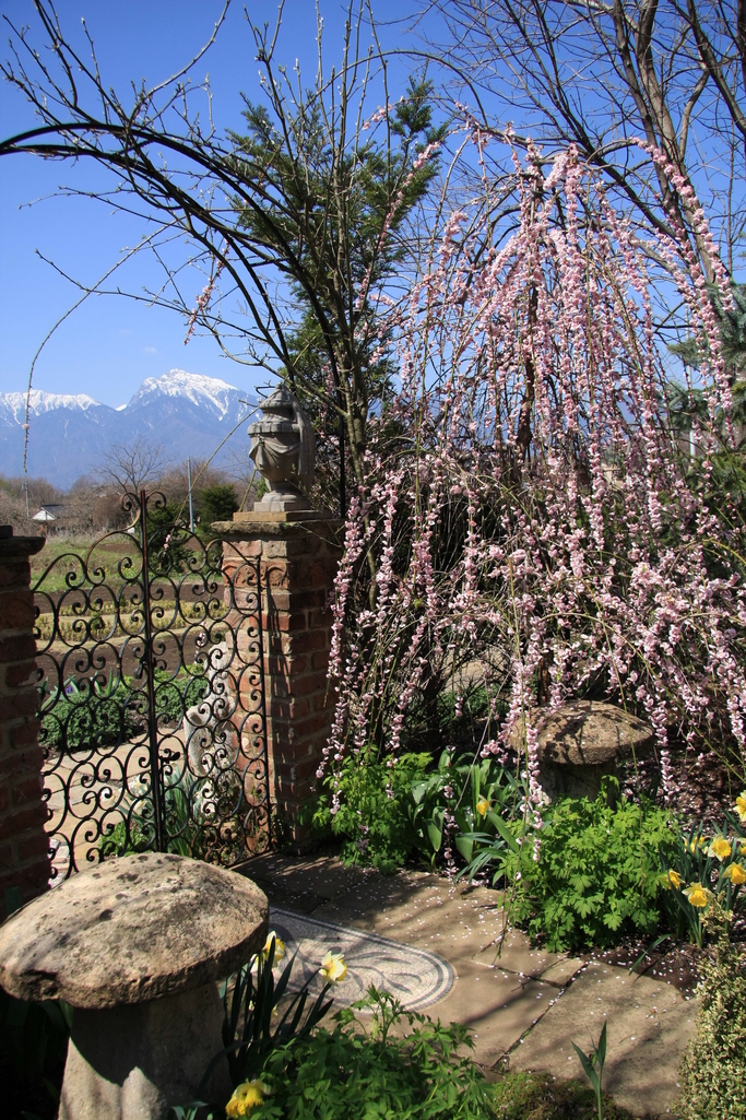 (イギリスではなくて)ここは日本の庭だったか...と我に返った画像です。枝垂れ桜と雪山が似合ってます。
