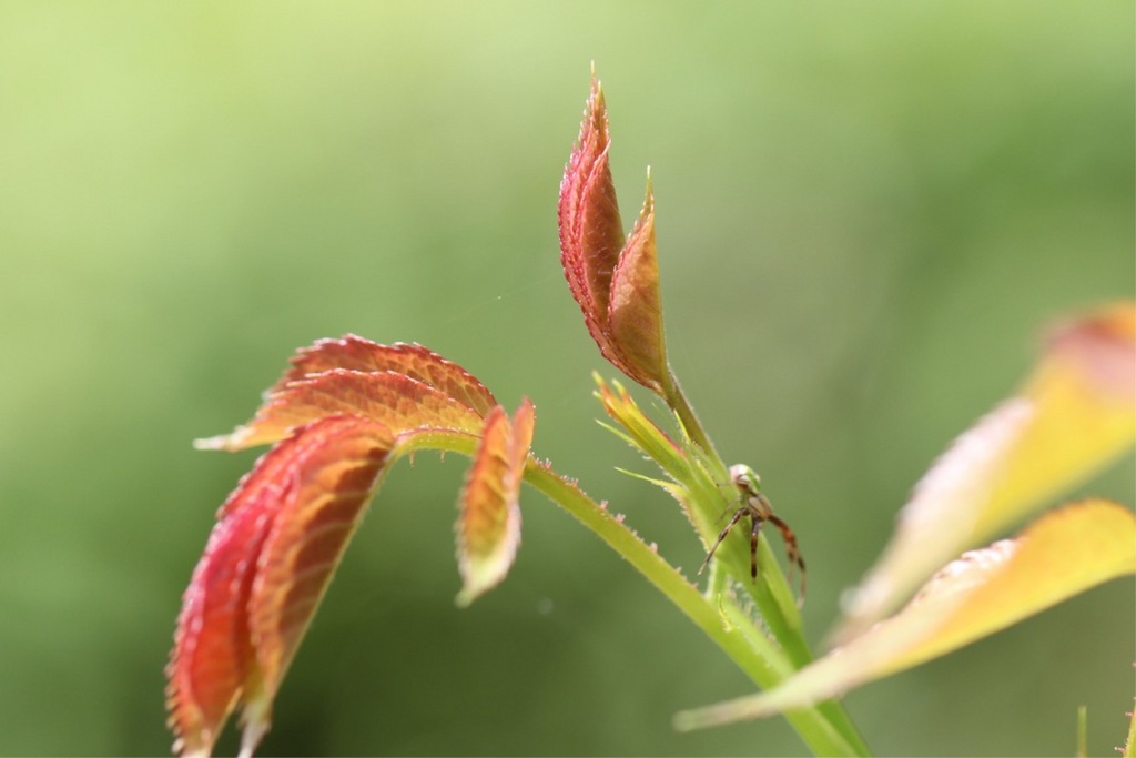 人の顔のような人面蜘蛛。写真を撮ろうと思うと、バラの新芽の周りをくるくる逃げ回ります。頑張って、いい仕事してね〜(^_-)