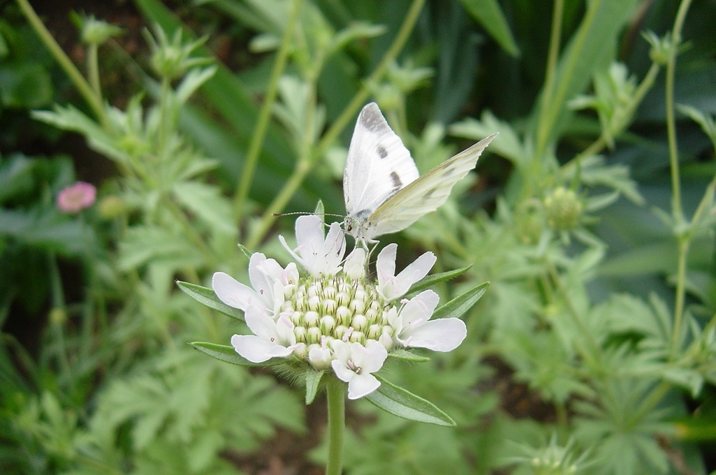 スカビオサ・ドラムスティック、花後、面白いですね^^スカビオサって、こんな種だったんですね。モンシロチョウが来て、白い花に白い蝶、素敵ですね^^