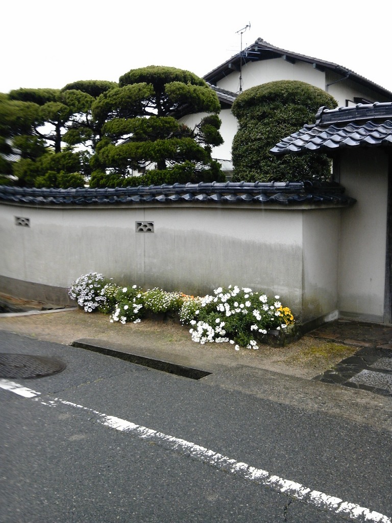 格式高い、日本家屋のエントランスの小庭に、白いディモルフォセカが咲き乱れていました。