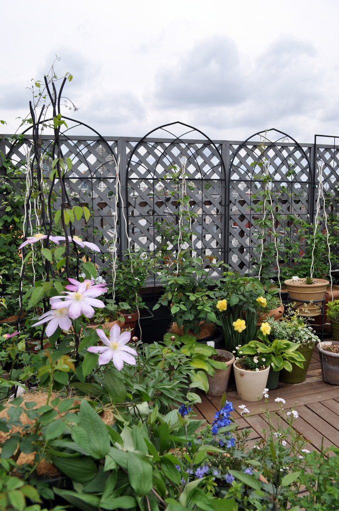 パテンス系クレマチス「さくらさくら」が咲きました。大輪で薄い花びらはそよそよと風が吹くと気持ち良さそうにそよぎます。(写真左側)