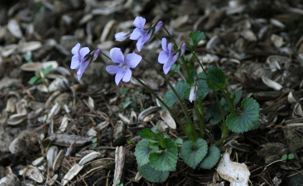 これは前の写真のスミレを横から撮ったものです。野鳥のエサ台の下なので、ひまわりの種の殻がいっぱいおちています。