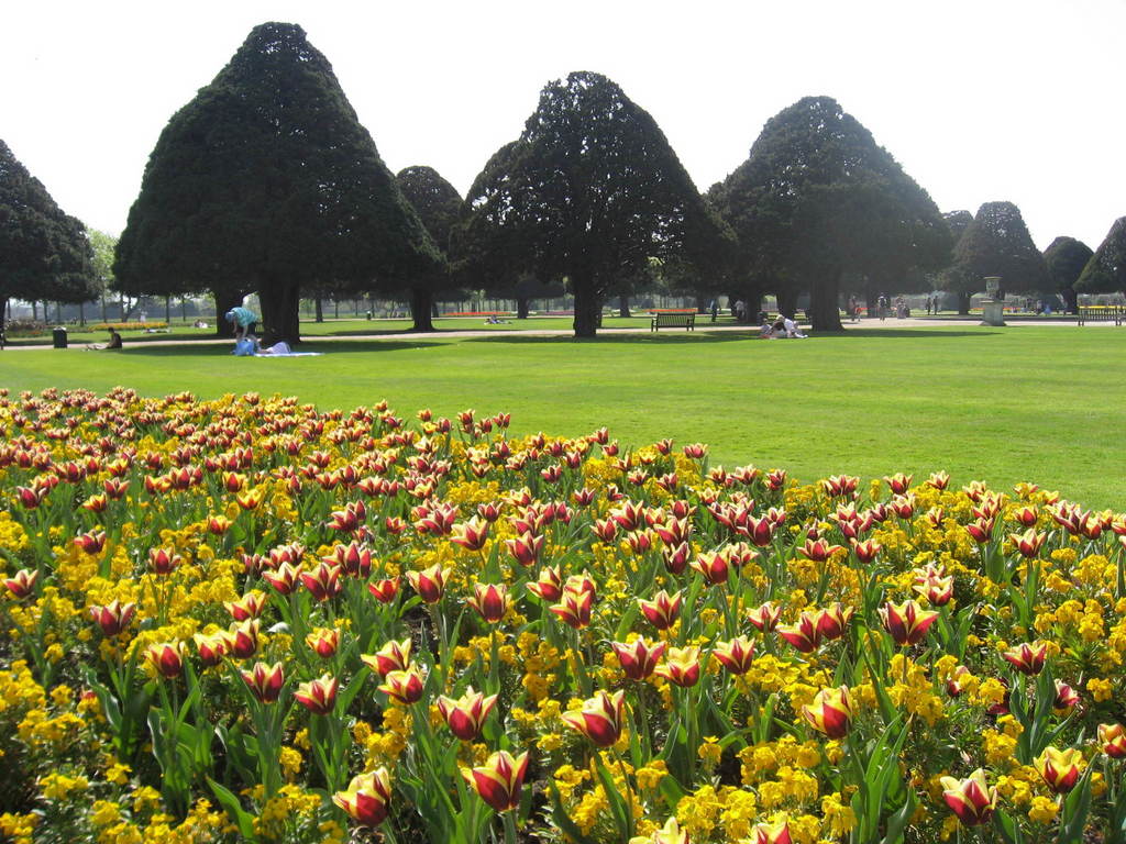 この木の形、おもしろい~!! こんな大きい木をどうやって剪定するのでしょう??? チューリップも可愛いですね♪ 黄色いのはなにかしら???