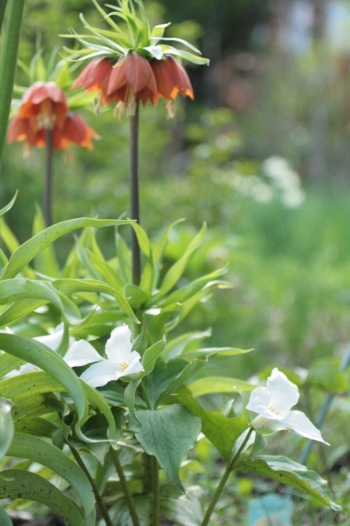 鳥小屋の前でばっちり大きくなっていたエンレイソウを・・私の花壇に去年お出迎えしました・・ちゃんと根付いて❤・・ヨウラクユリ(フリチラリア)をターシャは匂いが強いのでスカンクリリーと呼びます・・私も真似して☆