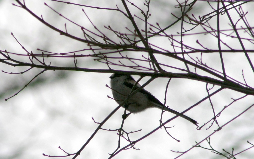 これは、エサ台には近寄らず比較的高いところに小枝にとまるエナガ。体はシジュウカラより若干小さいけれど、尾羽が長いのが特徴。