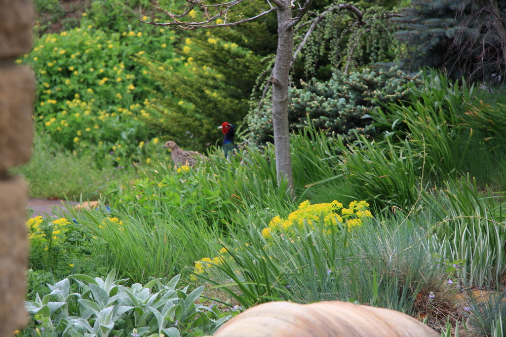 貴重なお写真ですね。(T&Kさんにはめずらしくもないのかな?) 私は実物をみたことがないです。キレイな方がオスですよね。一緒にお散歩なんて仲良しなんですね~。それにしてもTKさんの庭を散歩とは・・・なんて贅沢な!