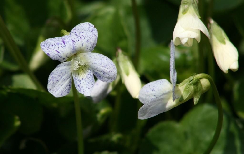 マルバシロスミレの大株の中にこんなのが混じって咲いていました。真っ白なところに青色を噴霧したようで素敵です。