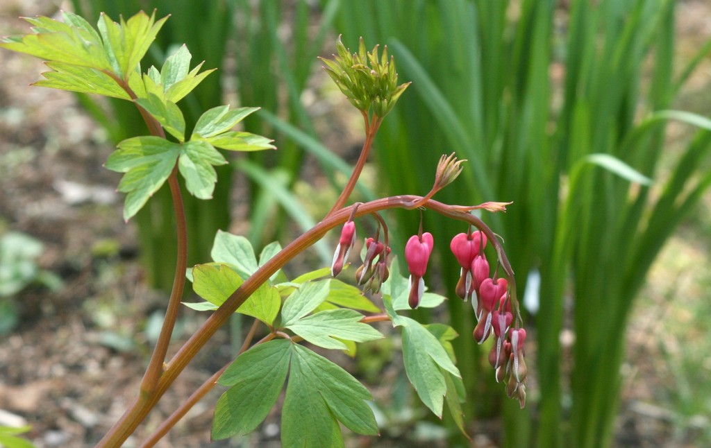 これは3年前に植えたタイツリソウが、今年も無事芽を出してくれました。まだ花芽が膨らんだ状態ですが、全部で3本もうすぐきれいに咲いてくれるでしょう。
