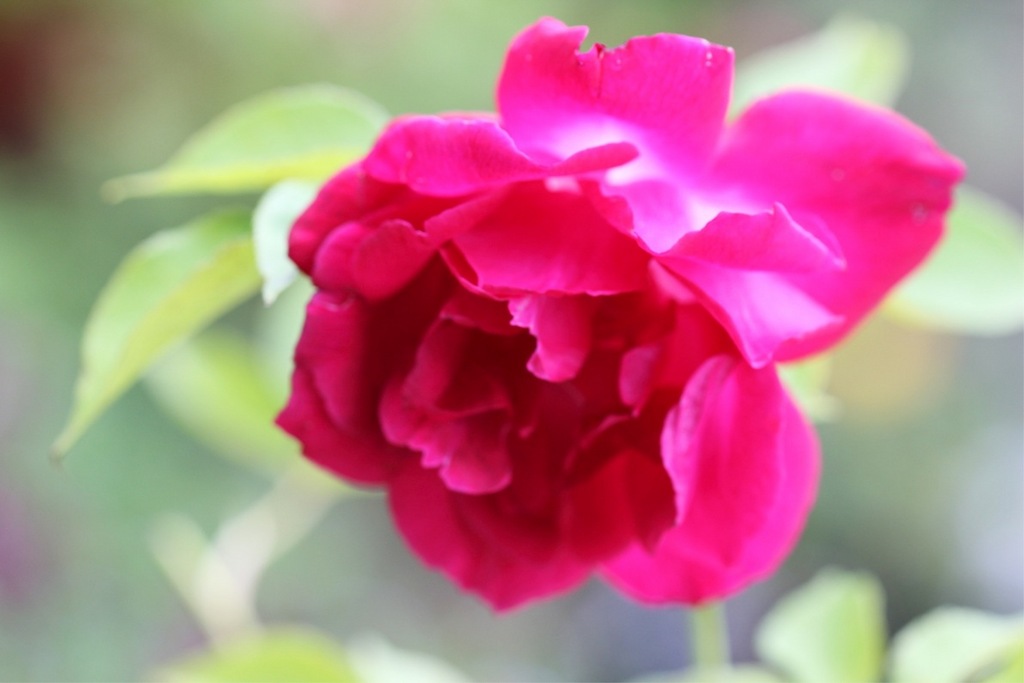 濃いピンクの半八重咲きでうつむいて咲く、クライミング ティーローズ。枝にはトゲが少なく、生育旺盛に伸びるので、フェンス、アーチなどに使うと良いそうです。300×180 半八重咲、明赤色 二季咲きを