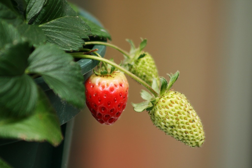 去年買ったイチゴ。サンルームで冬越ししたのが可愛い実を付けてくれています。