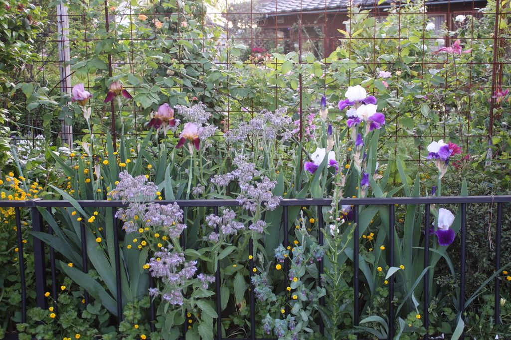格子のフェンス、ジャーマンアイリス、なんとなく和の雰囲気を感じます。