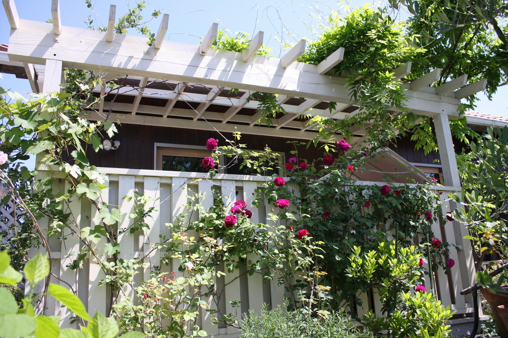 パーゴラもデッキのフェンスもまだ充分緑で覆われていない、作り始めて5年目の庭です。バラはイングリッシュローズのチャンティ。