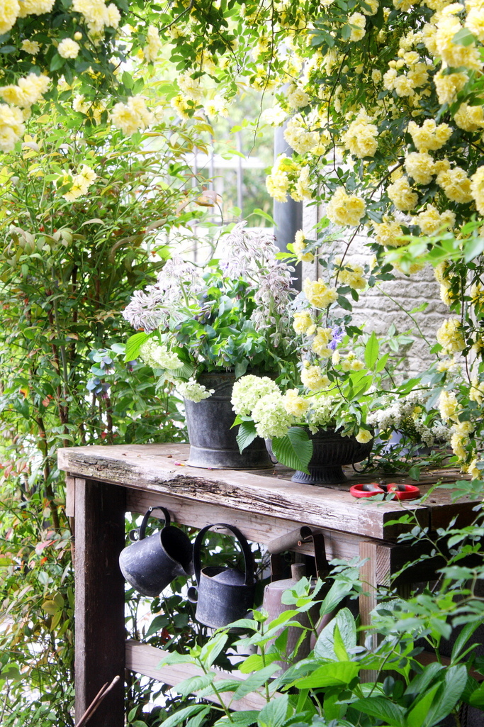 作業台も手作りですか?とっても良い色ですね~!モッコウ薔薇も綺麗ですね~!シルバーのポットがとってもオシャレです。