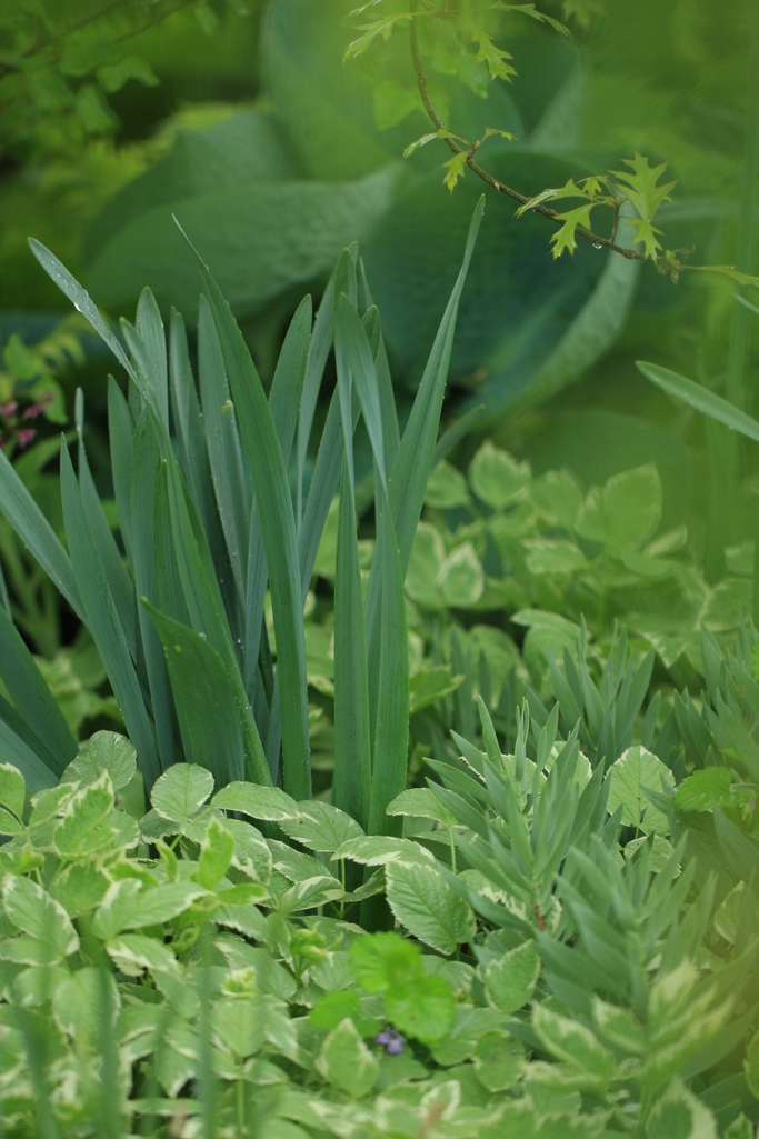 雨の日庭に日影のアエゴを写しました。斑入りの葉が雨にぬれ美味しそうに見えました。