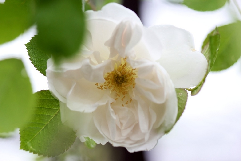 ルゴーサ(ハマナス)系 150 ×120 フランス 1887年 半つる性純白のゆったりとした半八重咲きの花がうつむいて咲きます。ちょっとくすんだ色のシベがたまらないです。ハマナスとティー系のソンブレイユとの交配種。比較的よく返り咲く。枝がやや広がって伸びるので誘引するか剪定するとよい。強健で少々の半日陰・やせ地にも耐えるそうです。
