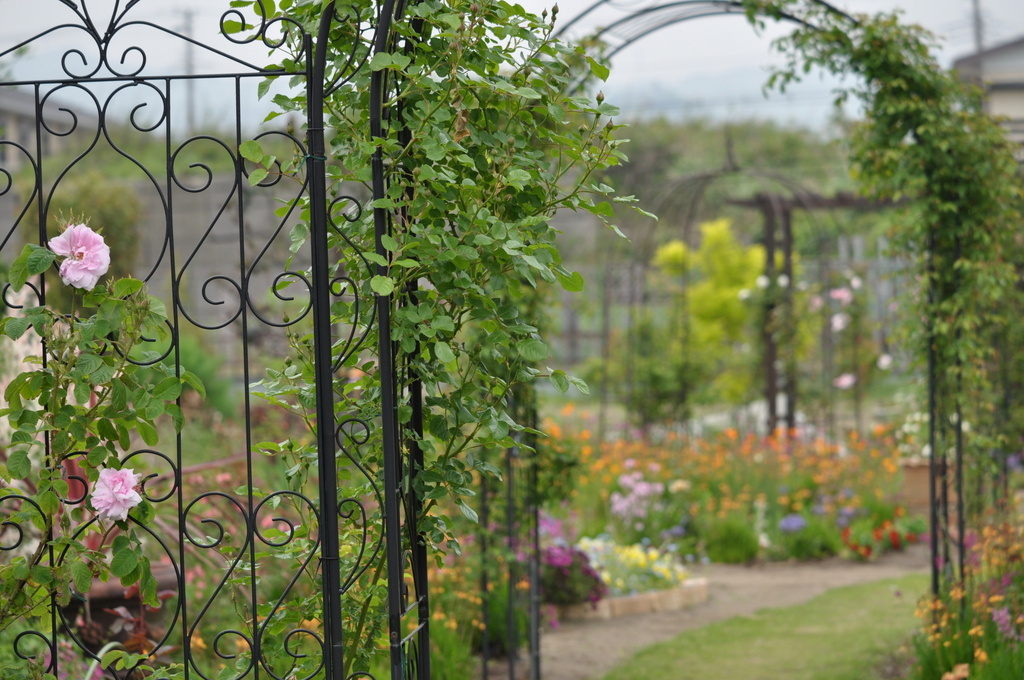咲いているのはオールドローズのロサ ダマスケナ ビフォーリア。ゲートのラベンダーラッシーはもう少し・・
