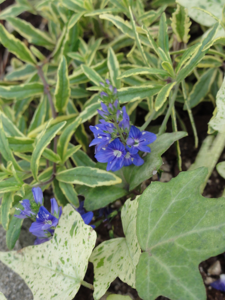 今年お迎えしたゴールドの斑入りの葉のベロニカに、花が咲きました。