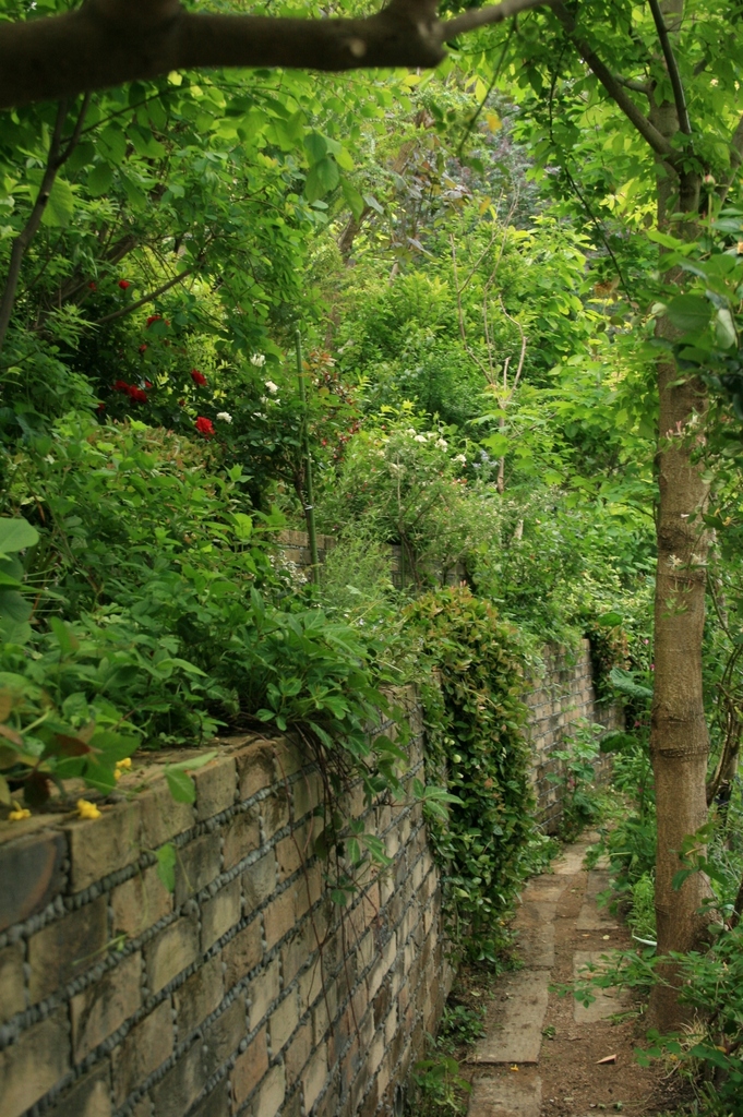 アメージングガーデンの薔薇のトンネルをくぐって、右の小道へ・・・葡萄のツルの下を進むと、数段、階段を下に降り、左を向いた景色です。私のお気に入りの、カメラアングルです。下の段の花壇が、ちょーどいい高さなので、小さな球根や、草花達に挨拶できます♡
