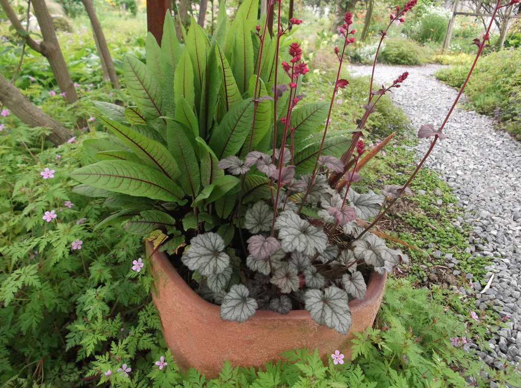 薔薇トレジャートローブの根元に置いた鉢。美しい葉色を楽しみます。
