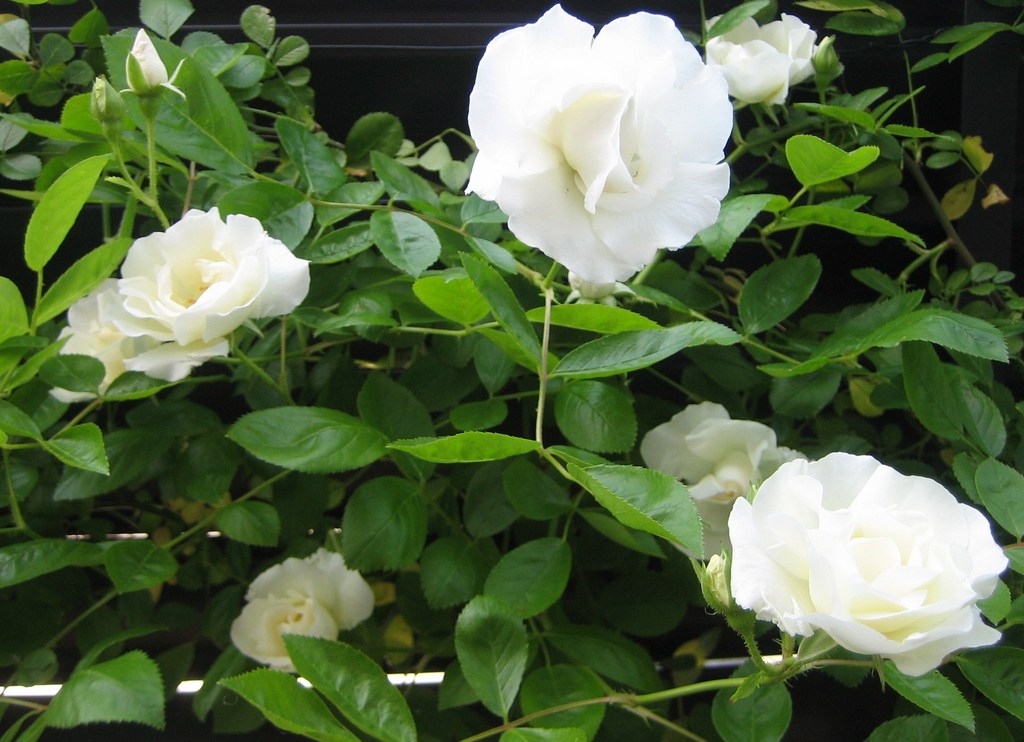 棘がすくなくて、ひらひらの花弁がかわいい中輪のツルバラです。花付きもよくとても丈夫ですが、チュウレンジ蜂の大好物。