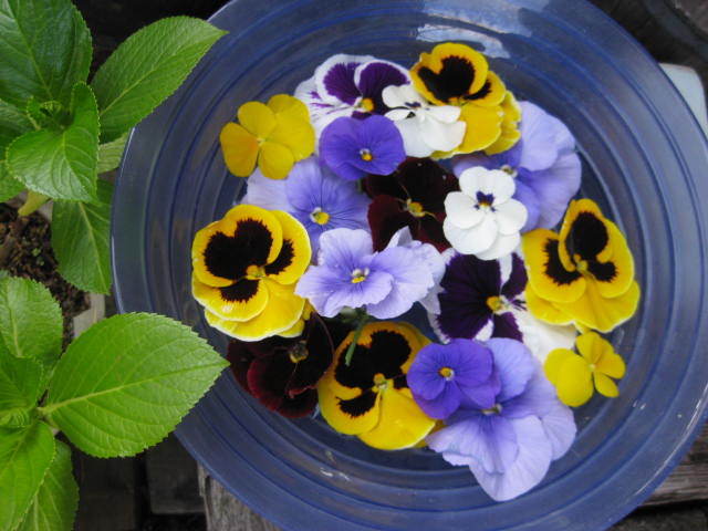 カットしたパンジー、ビオラを水に浮かべて・・・