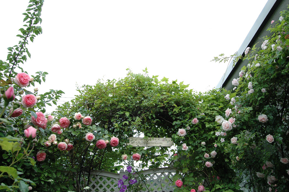 このアングル初めてです。正面のアーチはナニワイバラです。そして右側は昨日アップしたアーチです。左側の天まで届け~~~て伸びているのは1階の桜なのです~^^