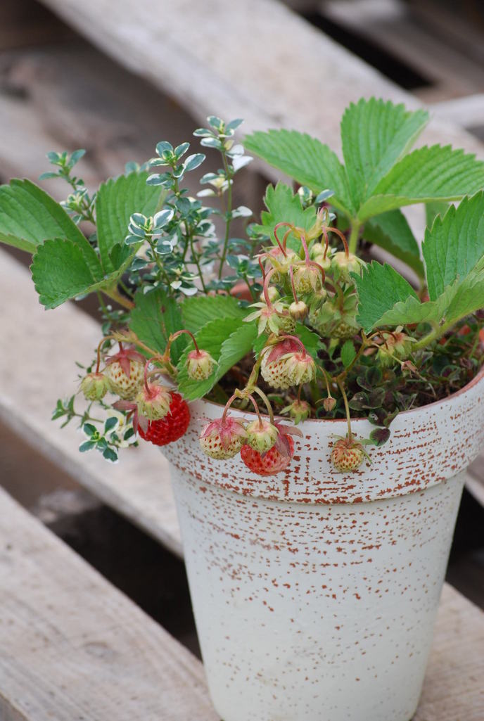 イチゴの寄せ植えって発想がステキ!とっても可愛いです^^それに美味しい収穫ありだし、最高!