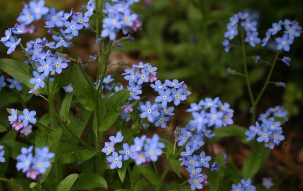 バラの足元に昨年のこぼれ種から芽を出した勿忘草が今満開です。