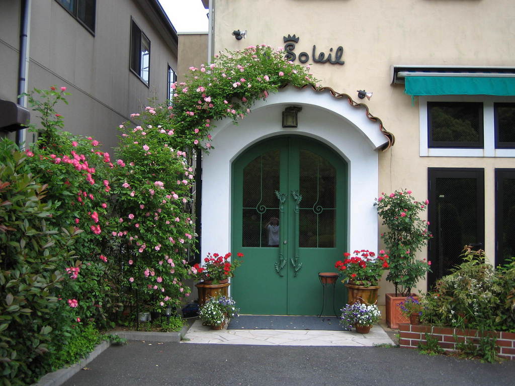 満開のツルバラにみとれて、思わず足をとめてしまいそう。ドアのデザインも素敵です。
