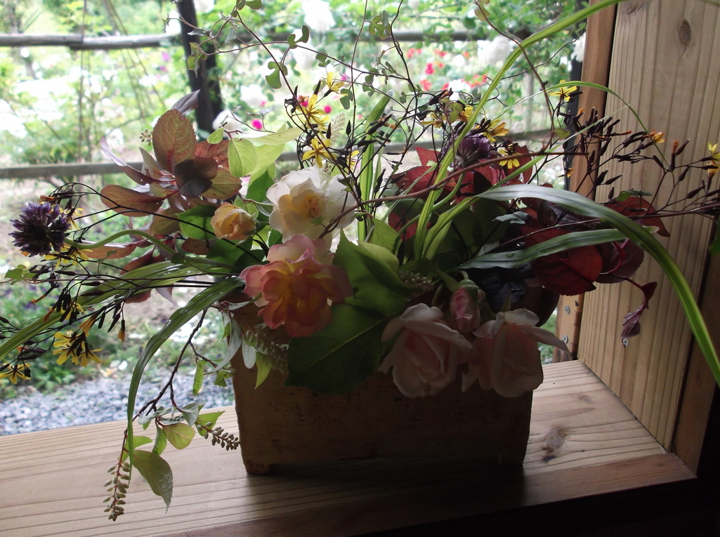 コバノズイナ、フウチソウ、ニガナ、咲き始めたつる薔薇などををとりどりに・・