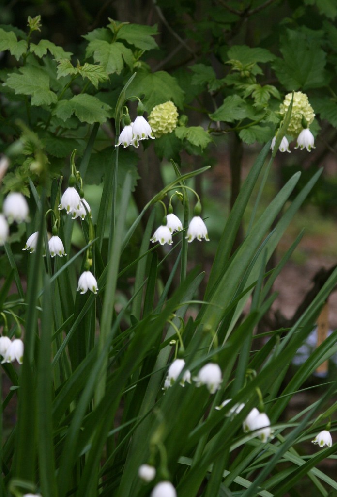 スノーボールの木の手前に植えたスズラン水仙のスノーフレークがちょうど今満開になりました。