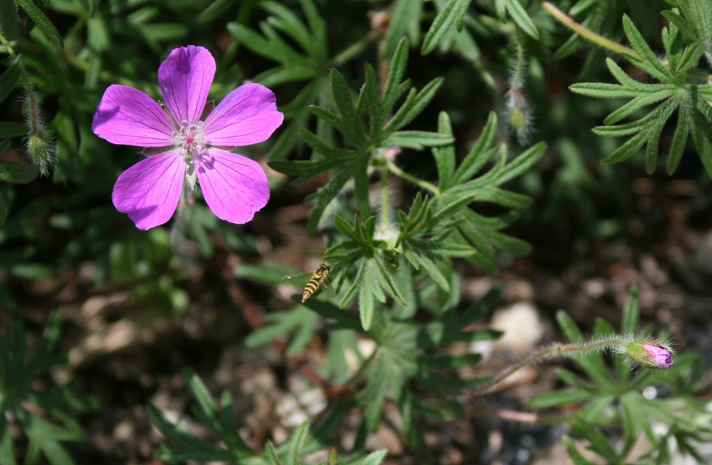 今年の一番花が咲きました。明るい太陽に照らされ淡いてピンクに見えますが、ほんとの色がとっても濃いピンクです。花のすぐ横にはヒラタアブがとまっていました。