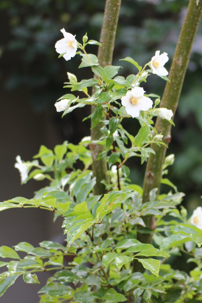 枝が長くなったバイカウツギのベルエトワール、シマトネリコの細い幹に絡ませてます。