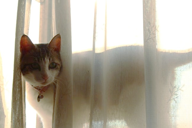 ももたん、こんにちは^^ 今日はカーテンで遊んでたのかな?窓から何か楽しいものが見えたのかもネ(*^^*)