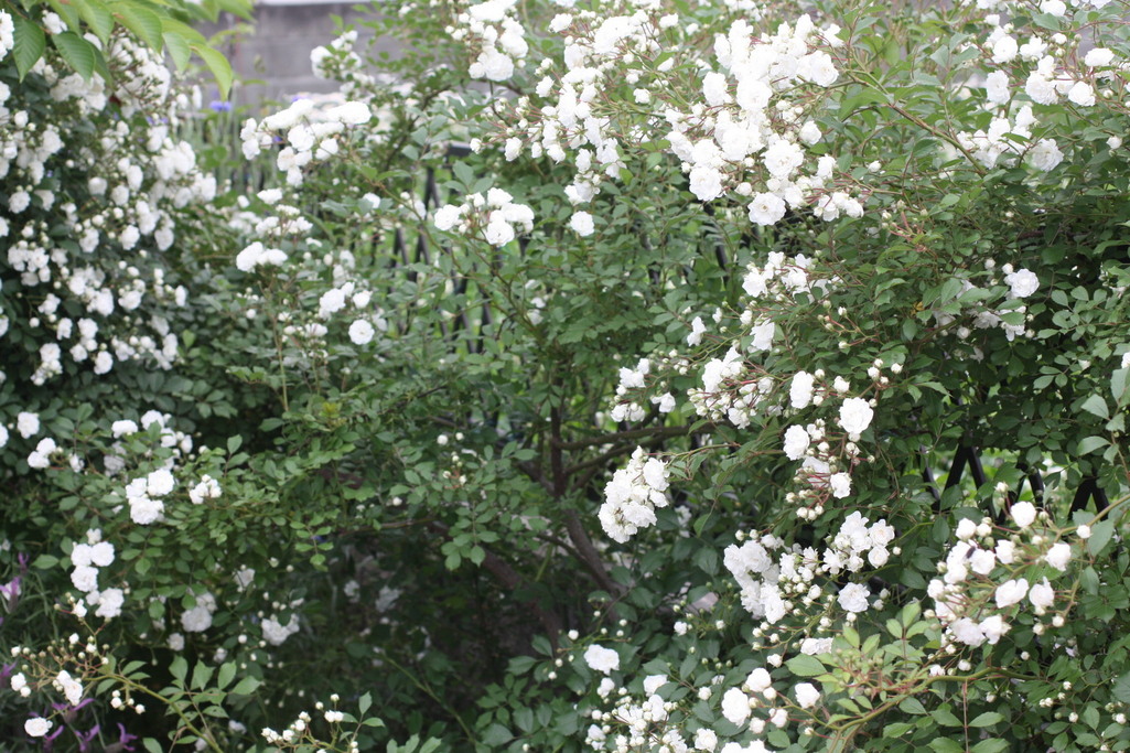 すばらしい花付きのアルバ・メイデイランドです。遅咲きのバラですが、これが咲くとうれしさでいっぱいになります。