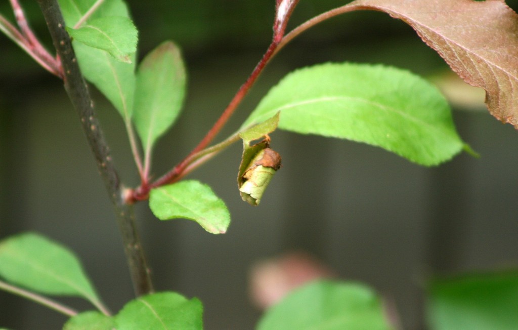 これは、クラブアップルの葉がきれいに巻き込まれて「落し文」のような形になったものです。これは「オトシブミの揺籃」と言われる昆虫のたまごのゆりかごです。