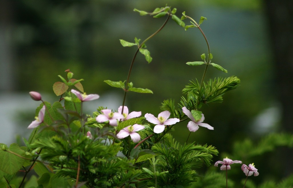 イチイの木の近くに植えておいたモンタナ系のクレマチスがイチイの上まで伸びて、かわいい花を咲かせていました。