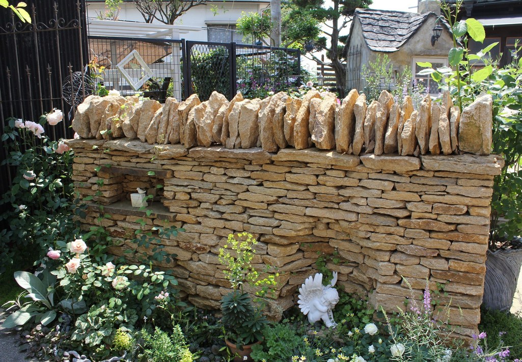 背景の石積みがボーダーの草花を引きたてて、素敵です。