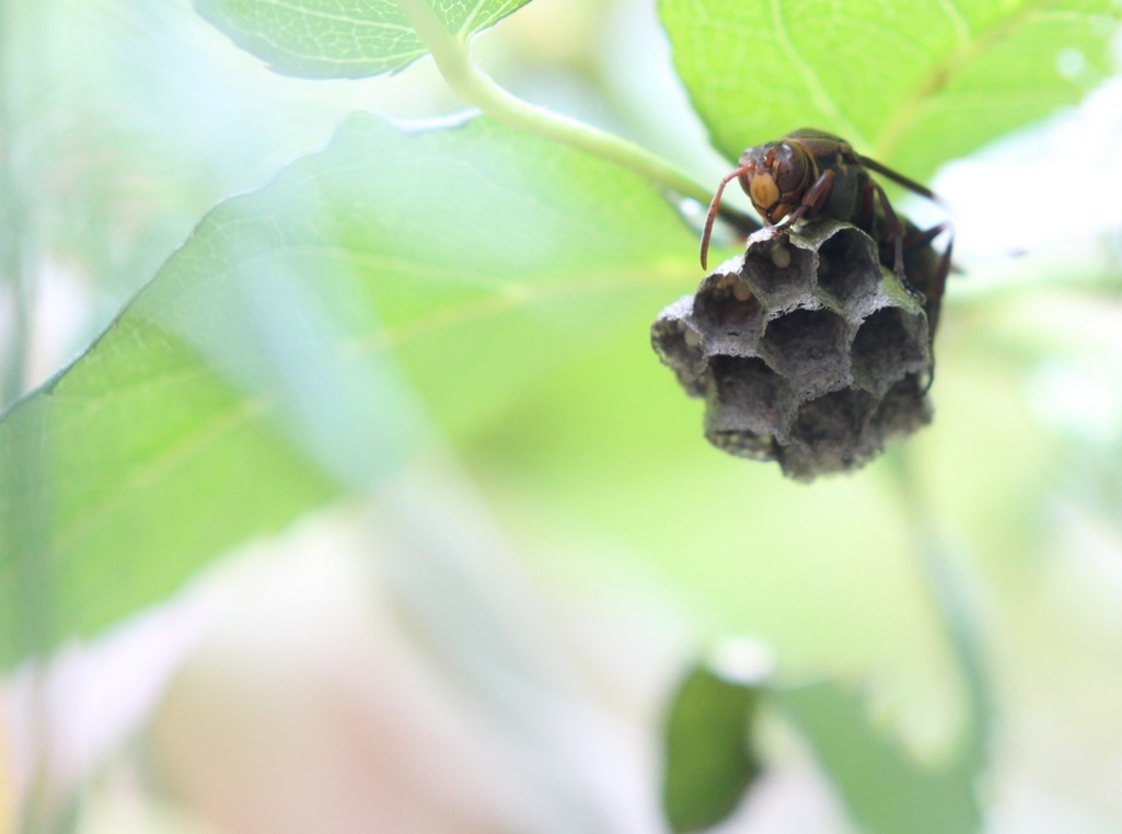 蜂が巣を守る姿が捉えられていますが写す時に注意ください、私はアジサイの葉の裏の蜂に唇を刺されたことがあります。