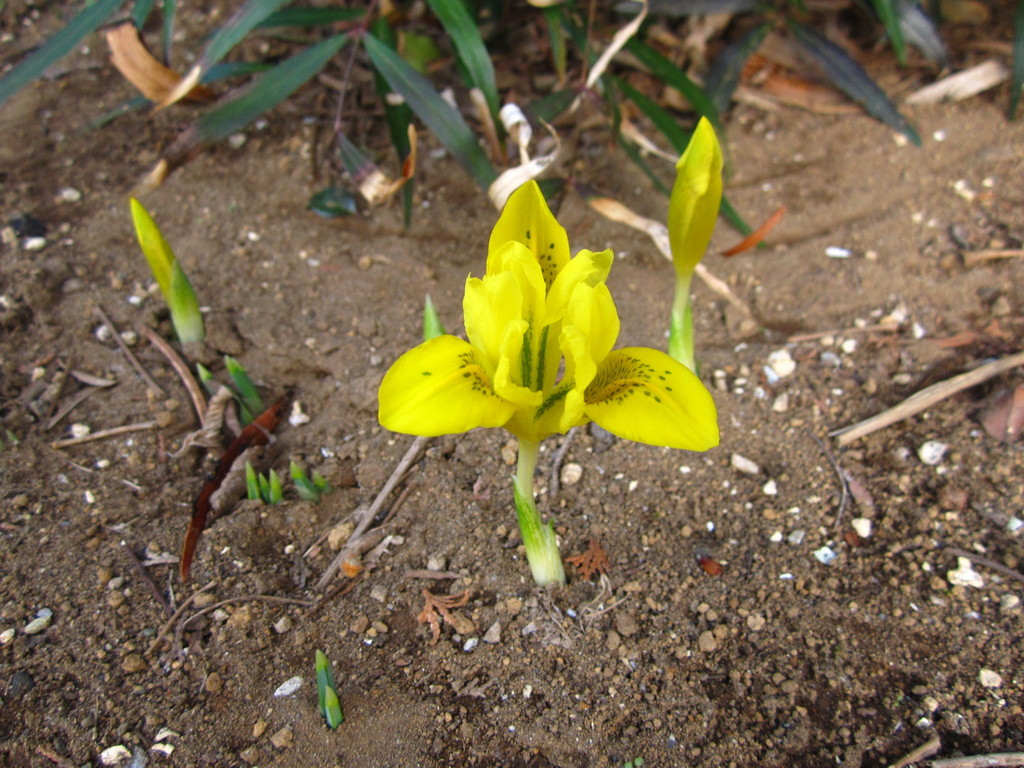 昨年植えた球根のミニ・アイリスが咲き始めました。品種によって、葉が先に出るものや、花の大きさも随分違うようです。