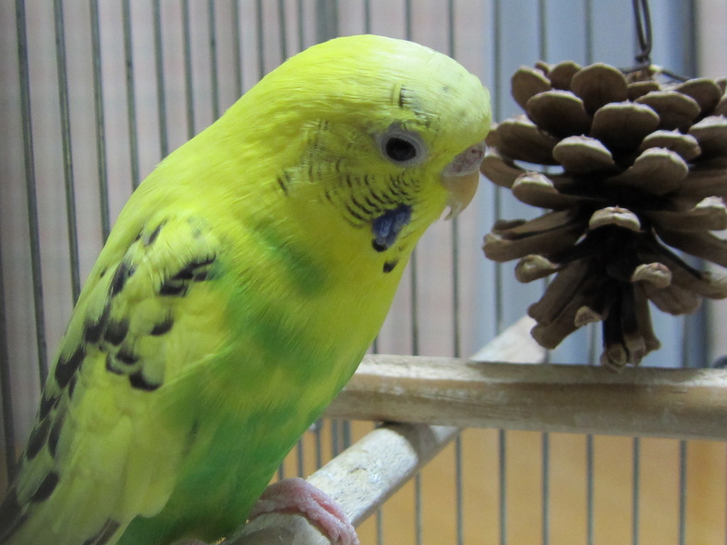 残念ながら指を齧られることはあっても、掌にはのってくれません。鳥かごの中で木の実や松ぼっくりのおもちゃを突いたり、小枝で作ったブランコに乗って遊んでます。