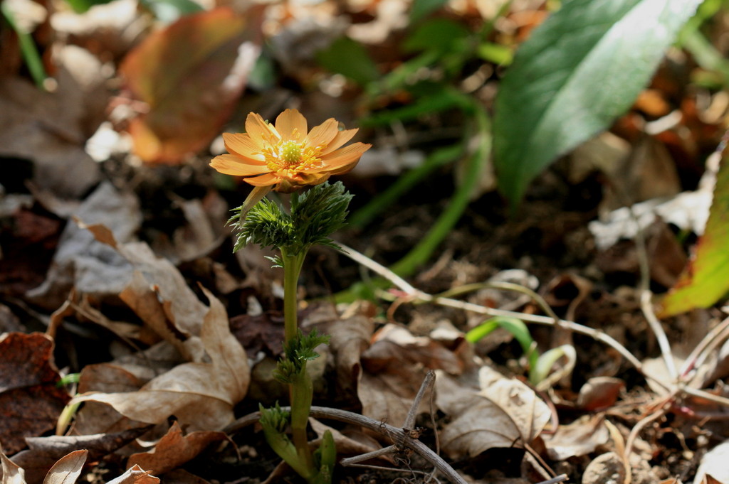 オレンジの福寿草ってあるんですね、初めて見ました。葉っぱの下にかくれてたなんて、踏まれなくてよかった~。宿根草が芽を出す季節、わくわくしますね!