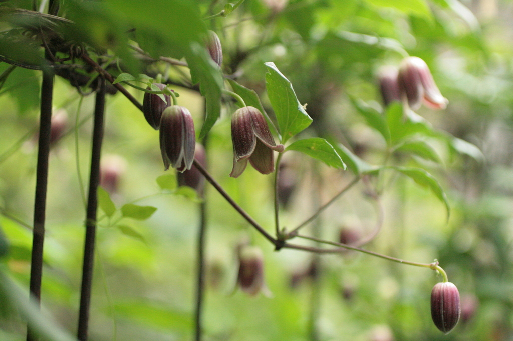 えらくシックな色のクレマチスですね。好みです♡ 竹籠にいれてお茶室に飾りたい。