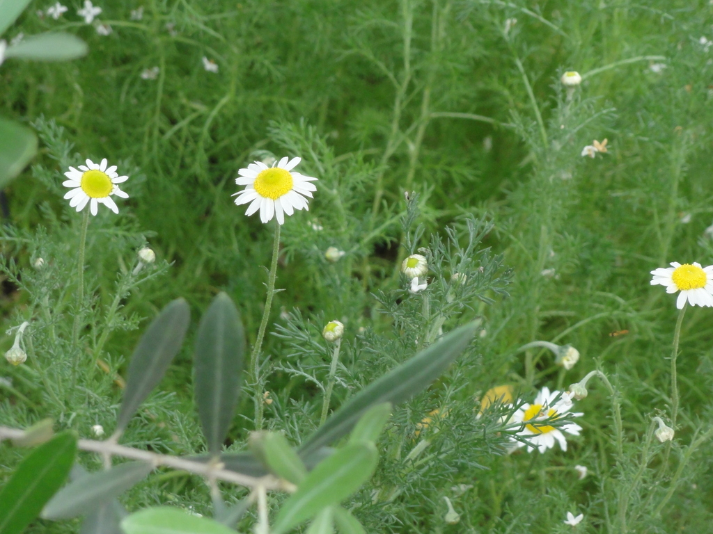 オリーブは星型の小さな花。落ちて、ローマンカモミールの葉の上にたくさん降りかかっています。風吹くと、爽やかな香りがしてきます。
