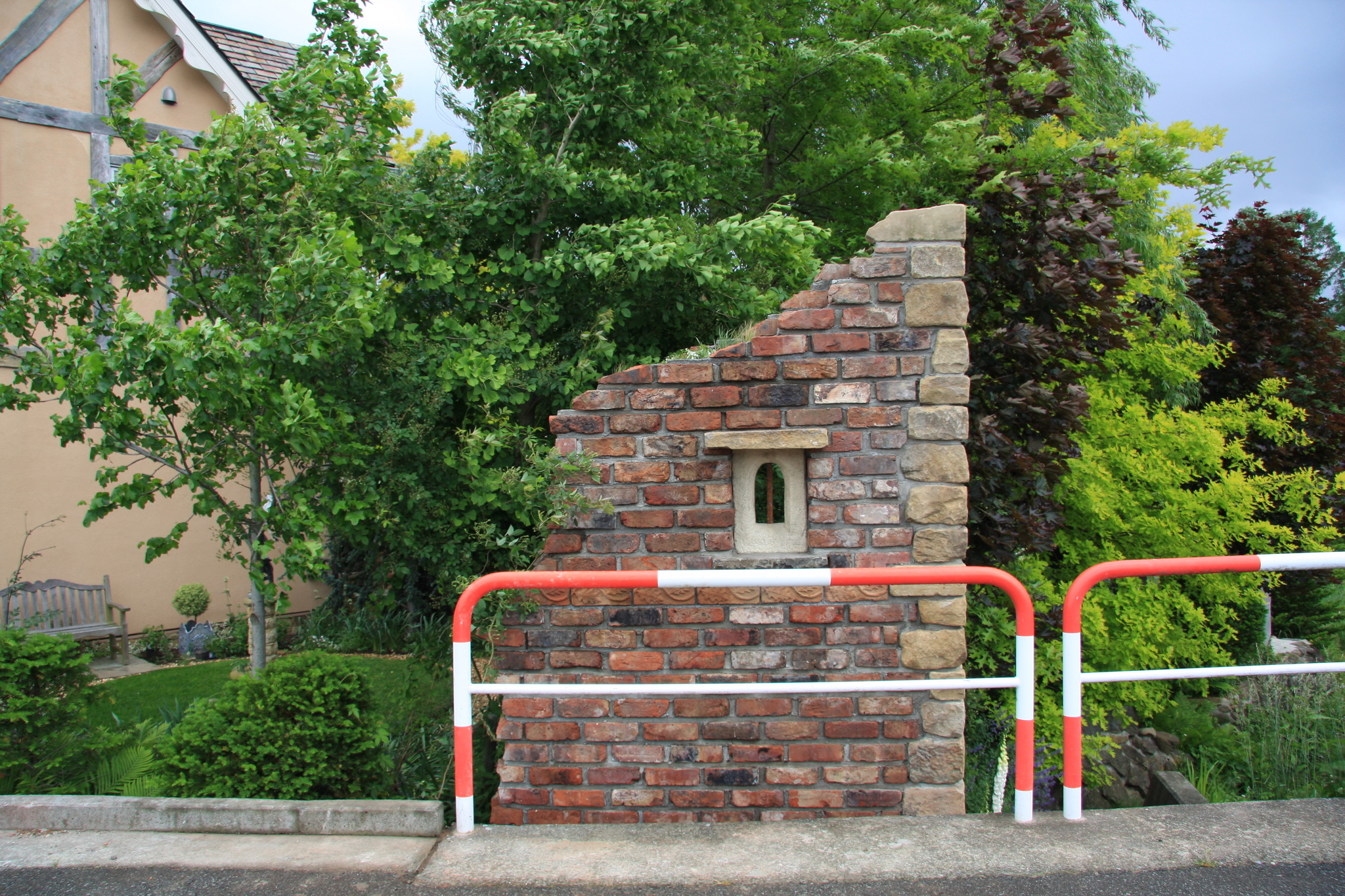 この壁を造るキッカケは、手前の道にあるカラフルなガードレールが庭から見ると、庭の景色が良くないため、目隠しのついたてとして考え制作しました。