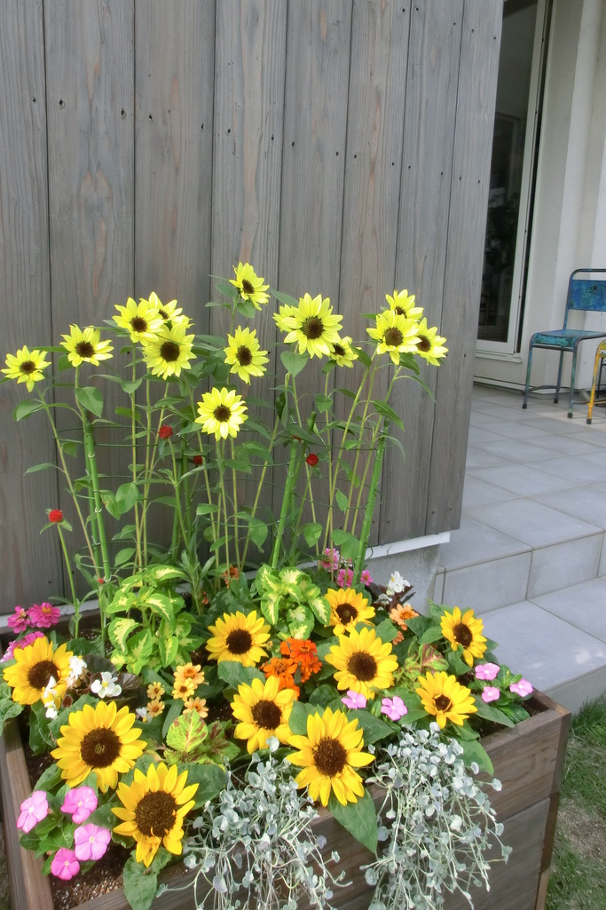 レイズベットを作って、ひまわりを植えました。リサイクルのピートモスの土を入れ、育てています