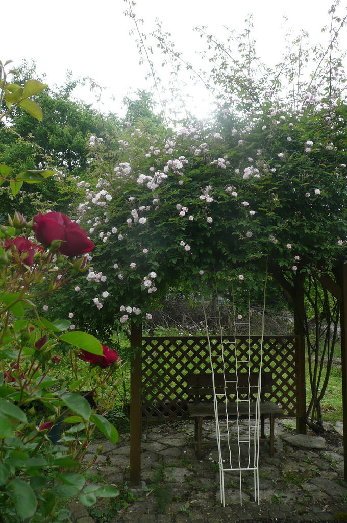 ベンチのついたすてきなパーゴラに、ポールズヒマラヤンムスクがわんさと絡んでステキです♡ ここに座るといい香りなんでしょうね~(*^^*)
